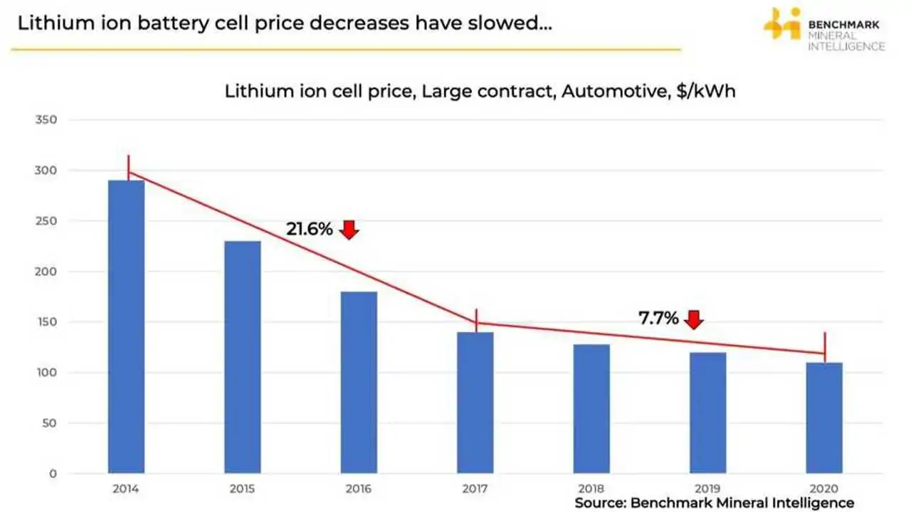 Secondo le stime di BMI, dal 2014 al 2017 il costo delle celle è diminuito in media del 16,5% all’anno. Ma dal 2017 al 2020 la riduzione media si è attestata al 5,8% all’anno. Simon Moores, direttore di BMI, è convinto che in tema di riduzione dei costi "le vittorie facili siano state già tutte ottenute”, anche se naturalmente c'è ancora moltissimo che si si può migliorare.