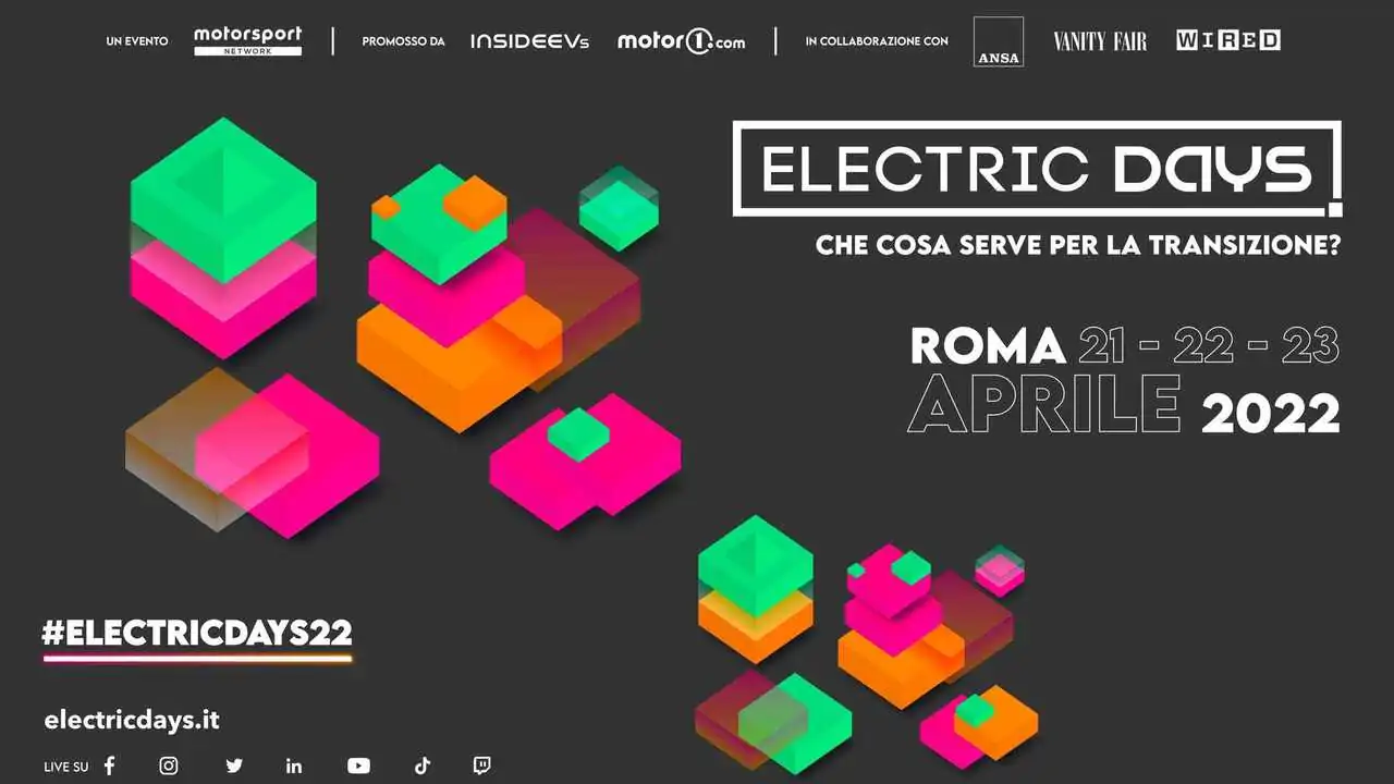 Gli Electric Days 2022 si svolgeranno in concomitanza con la Giornata mondiale della Terra, in una nuova formula pensata per approfondire la transizione ecologica della mobilità, le novità e le tendenze di settore: talk, dirette streaming, approfondimenti e live social interattivi si svilupperanno all’interno della sala Auditorium del Museo MAXXI (Museo Nazionale delle Arti del XXI secolo) di Roma e saranno trasmessi in diretta sui canali YouTube, Linkedin, Facebook, Twitter e Twitch di Motor1.com e InsideEVs.