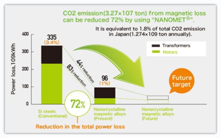 Il Nanomet ha la peculiarità di dimezzare le perdite di energia rispetto ai tradizionali motori utilizzati per le auto elettriche, che impiegano piastre in acciaio elettromagnetico. Questa minor perdita si traduce in un miglioramento dell’efficienza generale pari al 3% e questa sua capacità consente di ridurre le emissioni di CO2 legate proprio alla perdita di potenza del 72%.