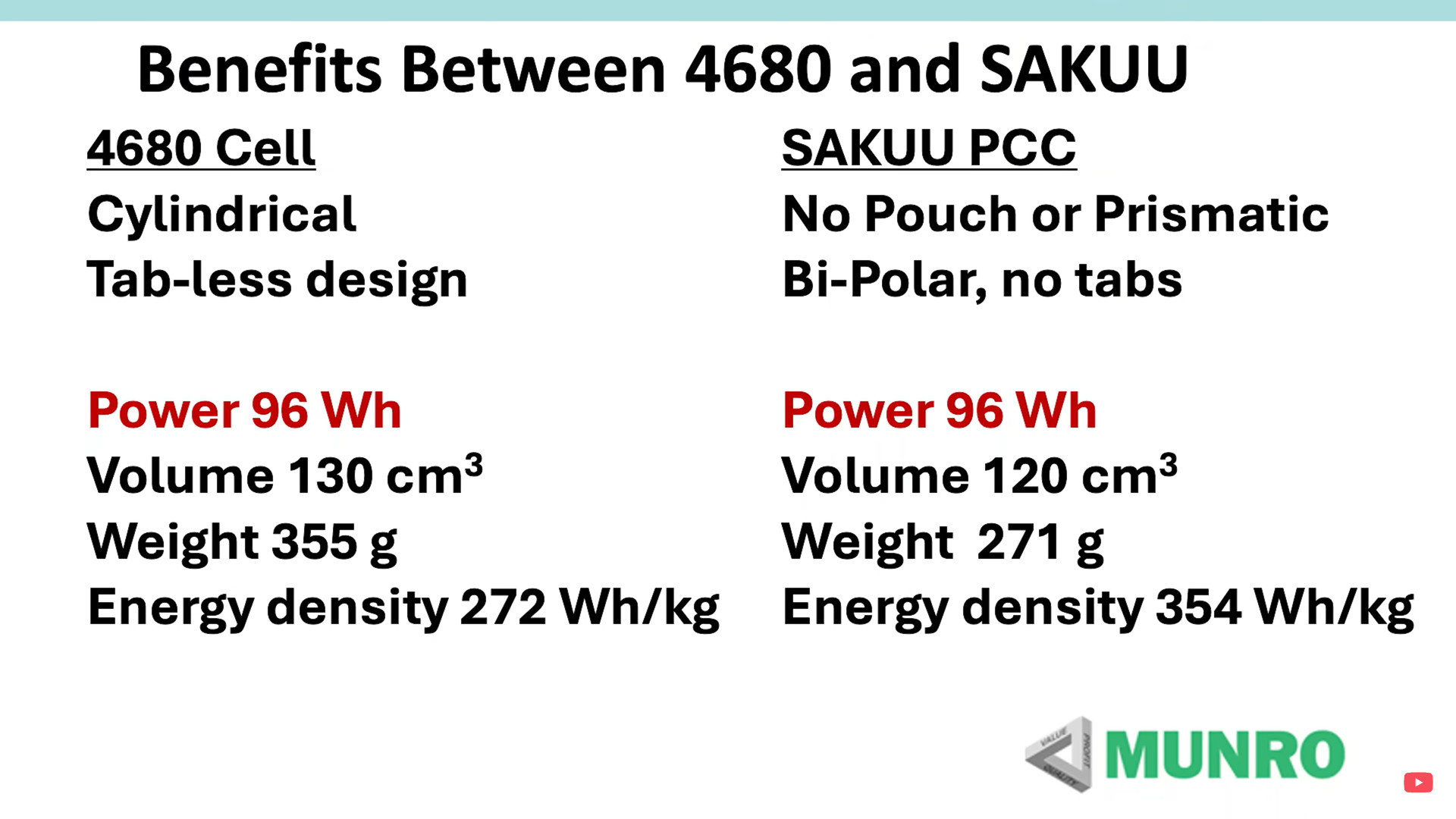 Sandy ora confronta la cella Sakuu senza fogli conduttori metallici con una cella 4680 (apparentemente Tesla). In un volume di 50 x 80 x 30 mm (120 cm3) può contenere 200 celle Sakuu, ma solo una singola cella 4680. La capacità di archiviazione di entrambe le soluzioni è esattamente la stessa, pari a 96 wattora, ma il peso di Sakuu è notevolmente inferiore. Ciò si traduce in una densità di energia gravimetrica significativamente più elevata.