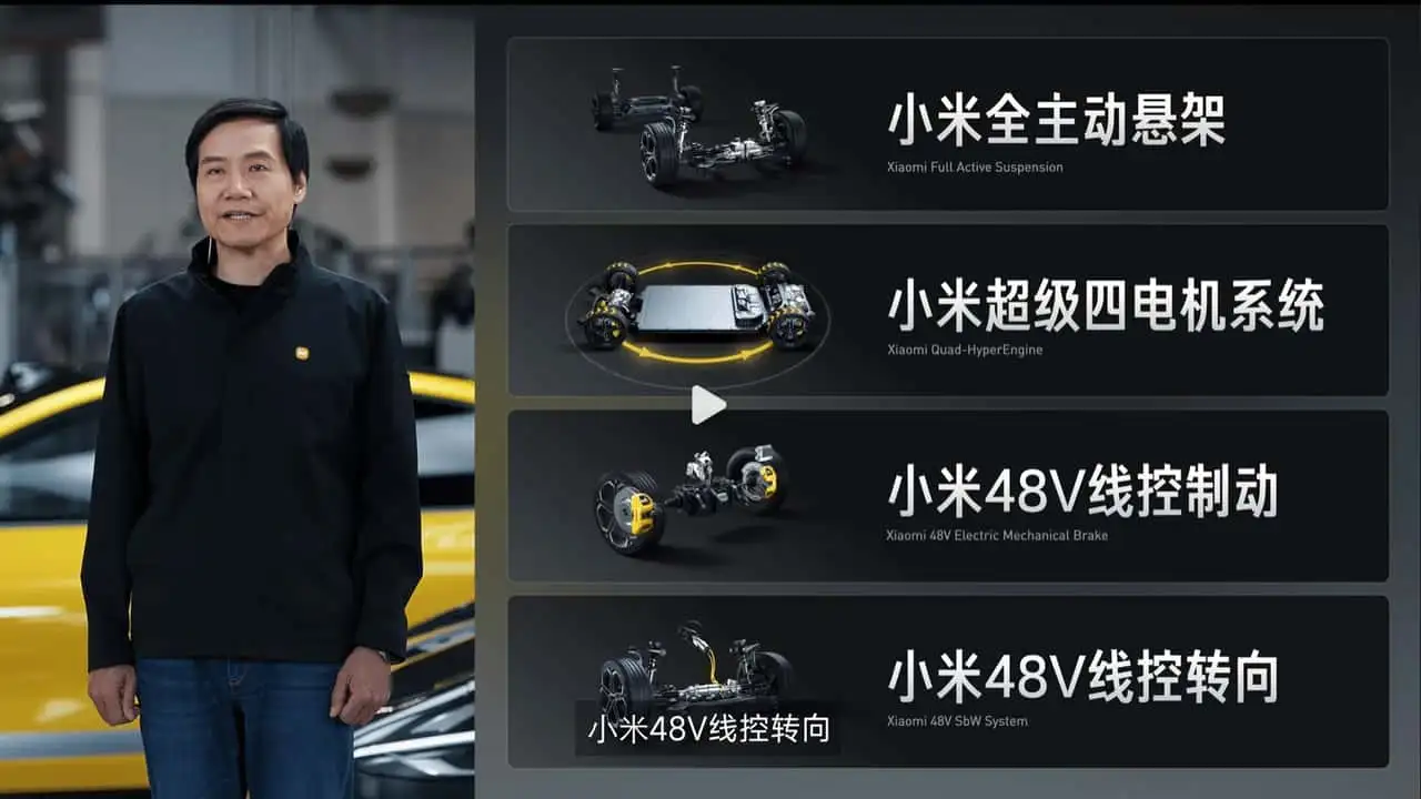La tecnologia del telaio Xiaomi è dotata di un sistema di sospensioni attive: ogni ruota possiede una fonte di alimentazione da 4,6 kW per regolare immediatamente l'ammortizzazione e ridurre il rollio della carrozzeria durante le curve, l'accelerazione e la frenata.