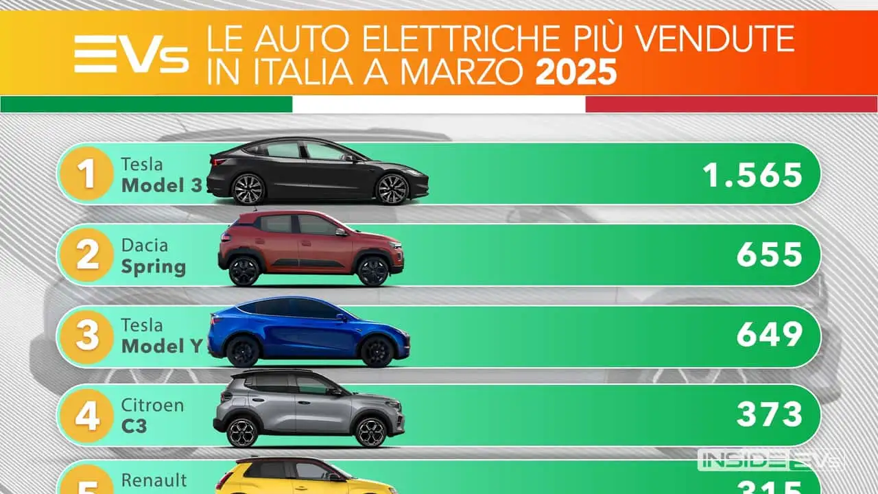 Venendo alla classifica dei modelli, la Tesla Model 3 supera i boicottaggi a Elon Musk ed è, al momento, l'auto elettrica preferita dagli italiani, tanto a marzo (1.565 immatricolazioni), quanto nei primi 3 mesi del 2025 (2.207 immatricolazioni). Segue, in entrambe le classifiche, la Dacia Spring. Qui sotto le top 10 complete.