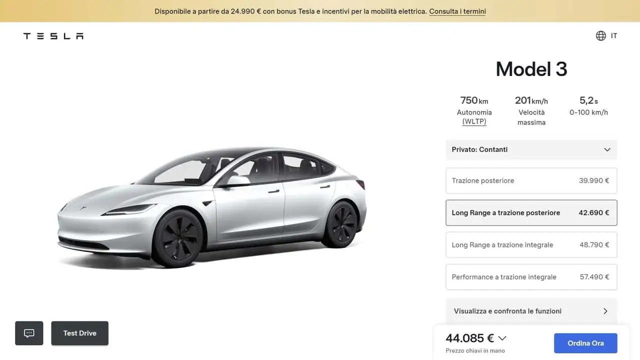 - “Grazie all’incentivo statale Bonus Veicoli Elettrici e alla conferma del Tesla Bonus, sarà possibile accedere alle seguenti configurazioni incentivabili di Model 3 e Model Y:
