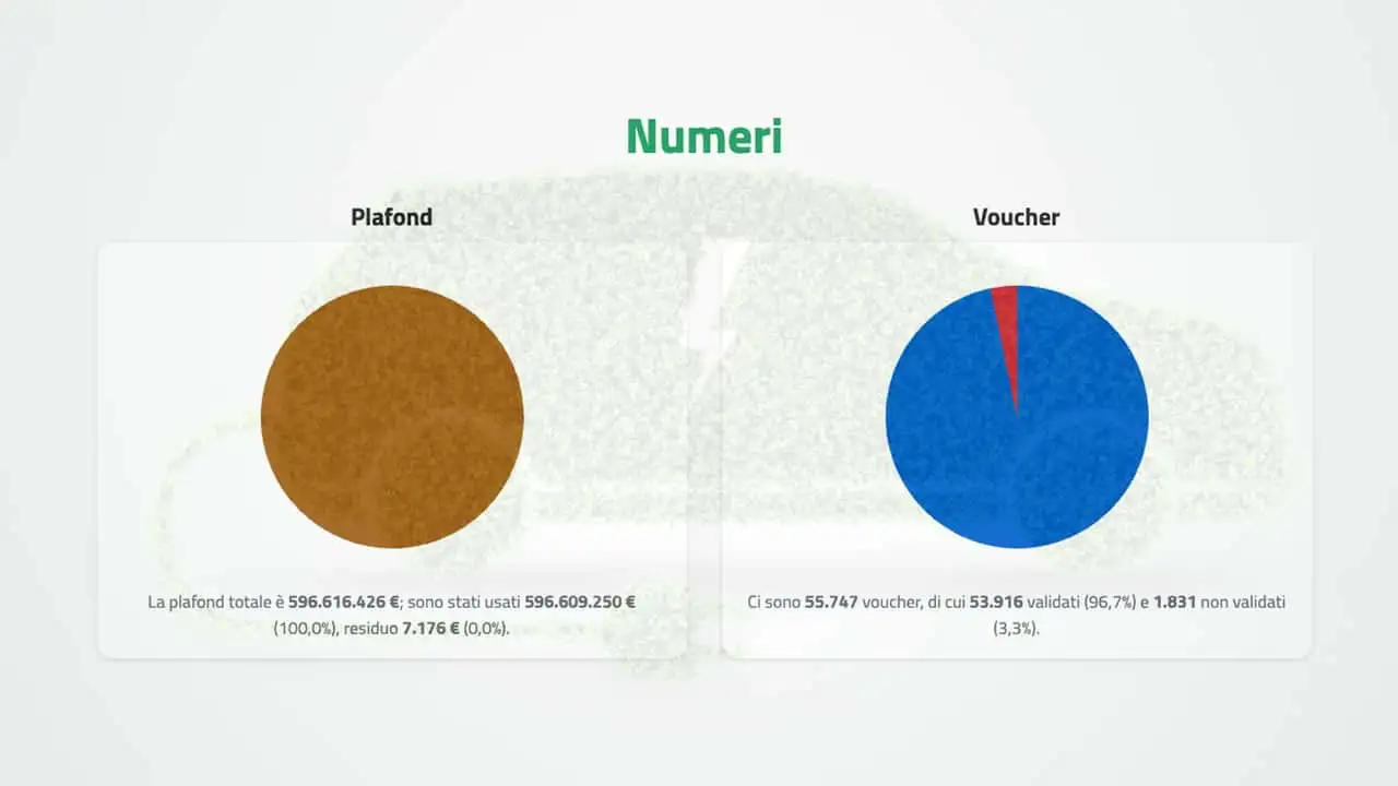 Nella pagina dedicata al plafond infatti il grafico dice che - a oggi - è stato utilizzato il 96,7% dei voucher emessi, pari a 53.916. Ne risulta che 1.831 (il 3,3%) non sono ancora stati validati. Il fatto è che tra ieri e oggi scadeva il termine ultimo per l'utilizzo dei voucher emessi il 22 novembre, seconda tornata per gli incentivi auto elettriche 2025.